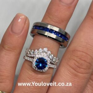 The 1.30 Ct. Sterling Silver Sapphire Tiara Cushion Cut 8mm Sapphire Round-Inlay Couples Wedding Ring Set