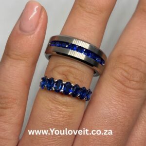The Sterling Silver Sapphire Half Oval Eternity 8mm Round-Inlay Couples Wedding Ring Set