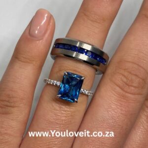 The Sterling Silver 5.00 ct. Aquamarine Radiant Cut 8mm Round-Inlay Couples Wedding Ring Set