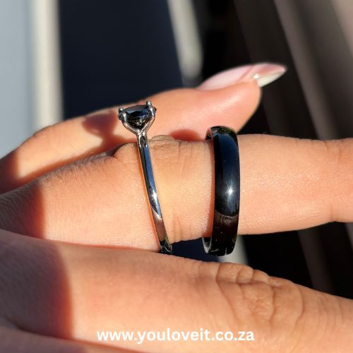 - Male Ring – Black plated Stainless Steel. Naturally silver underneath the black.