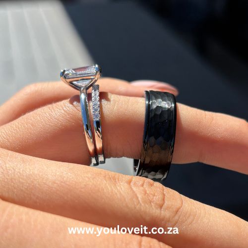 The 4.00 ct Emerald Cut & Titanium Black Hammered Wedding Ring Set