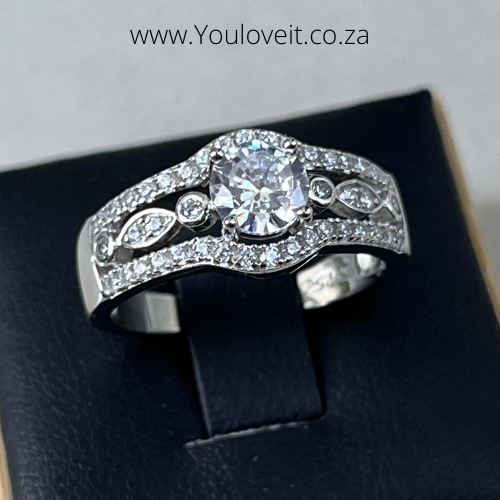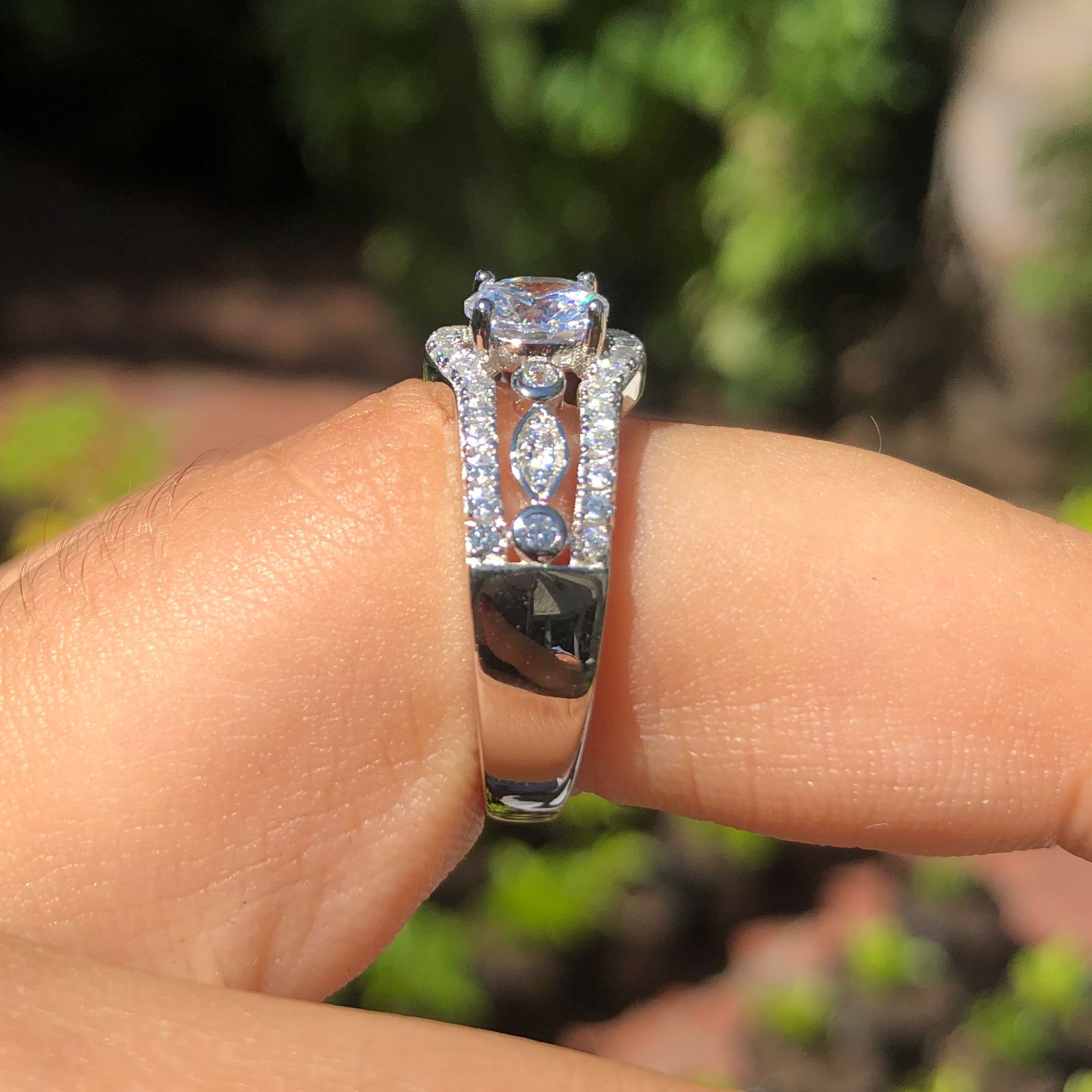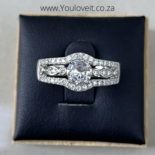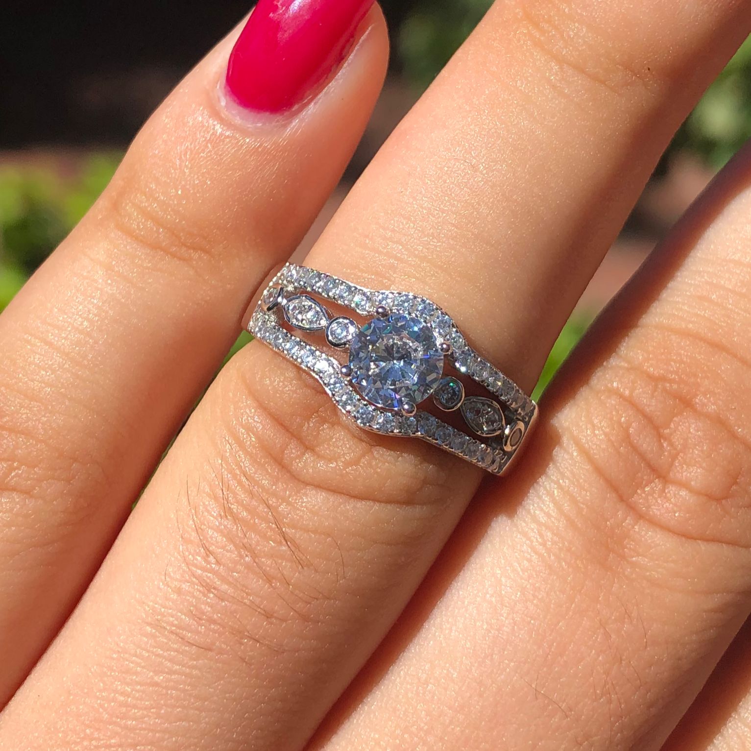 - Features a stunning 0.84 ct. round-cut cubic zirconia in the center. There is a mix of stunning round and marquise-shaped stones on the band. Add two of our stunning sterling silver bands to make this a wedding set.