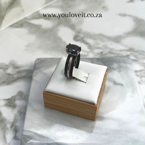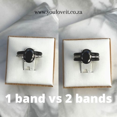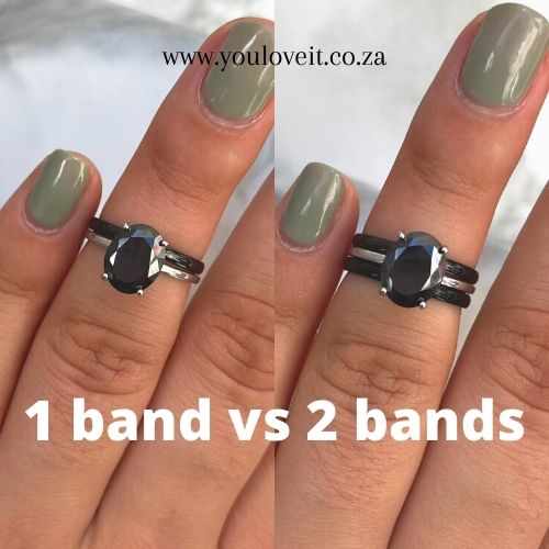 This wedding ring set pairs The Sterling Silver 2.00 Ct. Black Oval Cut Solitaire Engagement Ring with our stunning 2mm stainless steel solid black bands. Note that the bands are black plated and will eventually lose the black plating over time due to wear. Underneath the black, the band is silver in colour. Customers can either choose to purchase one band (2 piece) or 2 bands (3 piece).